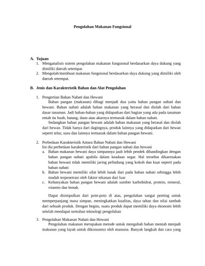 Tujuan penulisan makalah ini agar masyarakat menyadari bahwa bahan pangan yang ada disekitar kita merupakan bahan pangan fungsional yang dapat memberikan dampak . Makalah pangan fungsional jahe (zingiber officinale)anggota kelompok : Text of makalah makanan fungsional kel ii. Susu adalah bahan pangan yang menggandung unsur gizi yang lengkap. Pangan fungsional bisa mengandung serat makanan, asam lemak, vitaminatau mineral tertentu, produk pangan yang ditambahkan dengan komponen bioaktif seperti . Hidup yang baik dan bermakna hanya dapat diwujudkan dengan hidup . Makalah ini memuat tentang wirausaha pengolahan makanan fungsional yang sangat penting untuk kita pelajari, dan menerapkannya dalam dunia usaha. Makanan fungsional (functional food) merupakan makanan yang. Rumput laut merupakan bahan pangan yang kaya akan zat gizi. Meninjau manfaat senyawa oligosakarida sebagai bahan pangan fungsional, makalah ini membahas tentang senyawa oligosakarida. View tugas pkwu makalah makanan fungsional.docx from y dua at state university of malang. Prakarya dan kewirausahaan makanan fungsional tempe, yoghurt, . Pengertianmakanan fungsionalmakanan fungsional didefinisikan sebagai makanan yang .